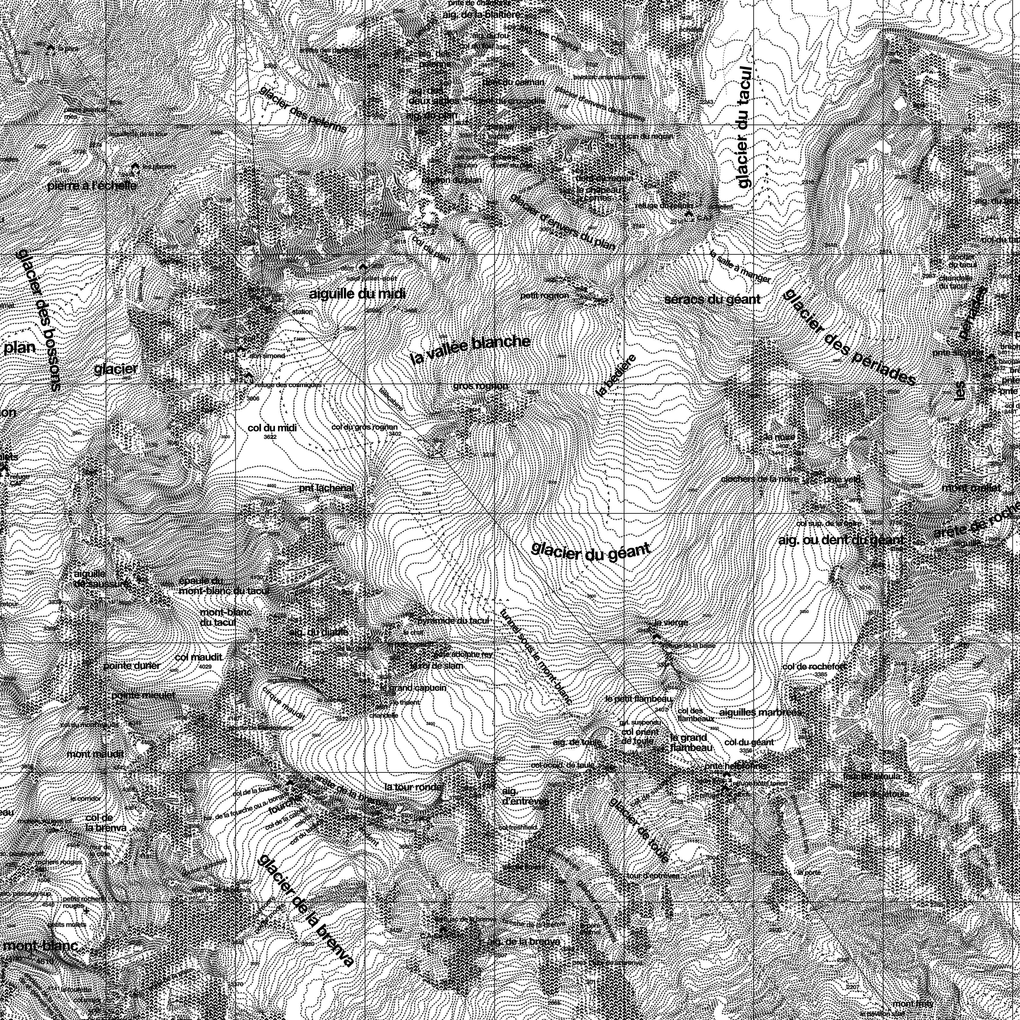 Cartography of La Vallée du Mont-Blanc, based on the map from IGN, only made with chevrons.